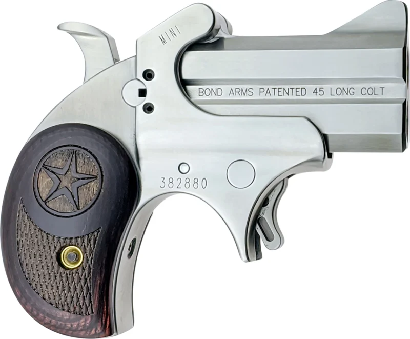 Bond Arms BAM Mini Original 45 Colt (LC) 2rd 2.50″ Stainless Steel Double Barrel & Frame, Auto Extractor & Rebounding Hammer, Blade Front/Fixed Rear Sights, Rosewood Grips, Manual Safety