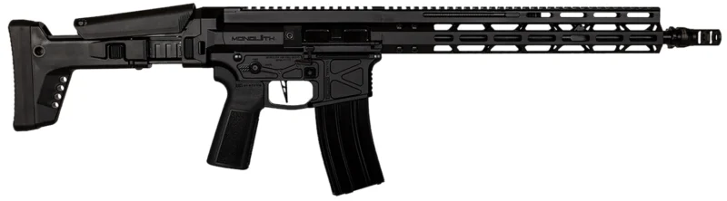 Global Ordnance Monolith 15A 5.56x45mm NATO features a 16.10″ barrel; 1:7′ twist; Integrated KeyMo Muzzle Brake; M-LOK handguard; ambidextrous bolt lock/release, thumb safety; 1913 Picatinny rail on receiver and polymer collapsible, side folding stock w/adjustable cheek rest. Includes one magazine.
