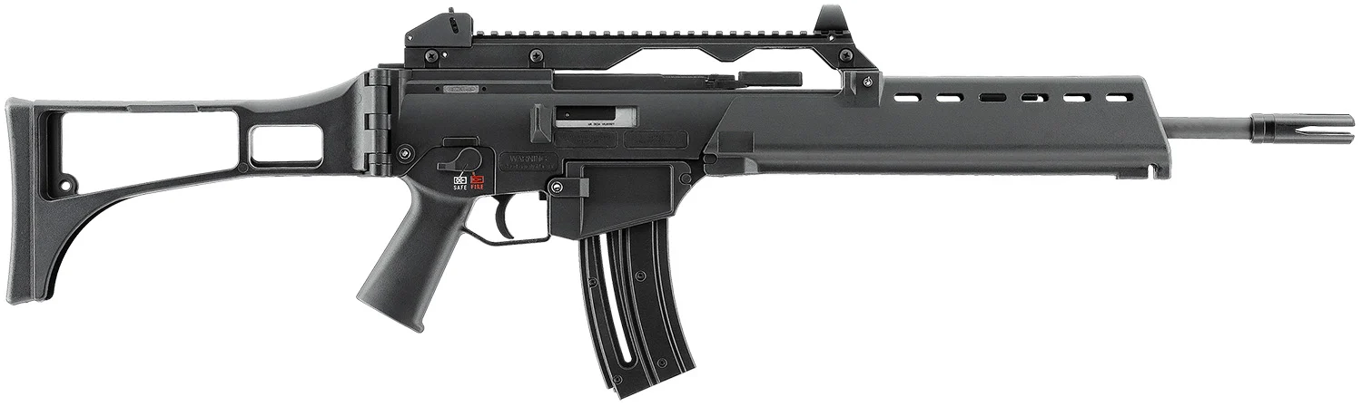 The Heckler & Koch G36 in .22 LR is a rimfire replica of the well-known G36 platform, configured for range use, training, and recreational target shooting. This semi-automatic rimfire pairs the G36 footprint with a synthetic folding stock and polymer furniture for familiar ergonomics and modularity. It ships with a detachable polymer magazine and is finished in matte black for a subdued appearance suited to training and sport shooting.