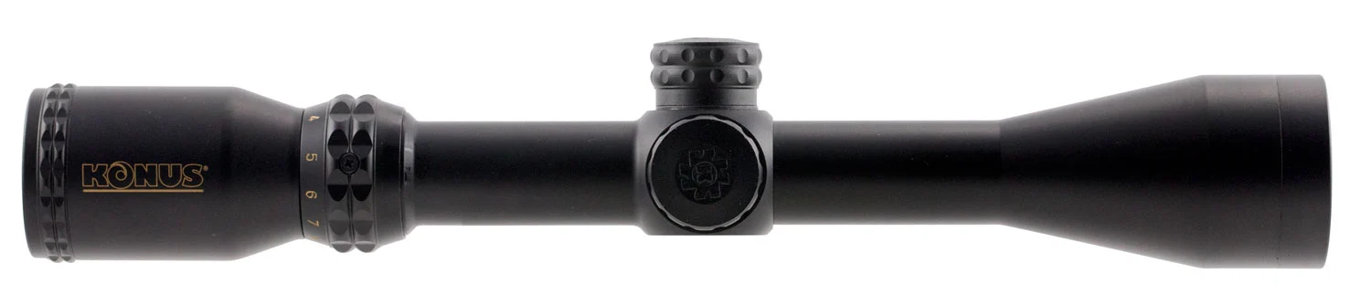 The KonusPro 550 exclusive ballistic reticle, provides a system of reference lines for exact aiming points out to 550 yards. Lateral hash marks allow for precise leads of moving targets as well as compensating for strong crosswinds. The engraved illuminated ballistic reticle is unbreakable and the multi-coated optics are clear and bright. Finger adjustable windage and elevation adjustments. It includes lens caps, battery and a lens cleaning cloth.