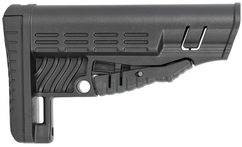 Stylish collapsible buttstock for COMMERCIAL SPEC buffer tubes. Sleek design with metal QD base on each side for QD slings. Integrated rubber butt pad for non-slip secure shouldering, comfort, and recoil mitigation. Unique latch mechanism, first click for adjusting stock position and a second full click for mounting/demounting from the buffer tube.