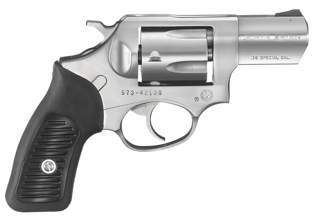 The Ruger SP101 revolver features a smaller Ruger cushioned grip system with no exposed metal at the back strap for shooter comfort. The patented triple locking cylinder mechanism securely locks the cylinder into the frame at the front, rear, and bottom. Its stainless steel frame has no weakening side plates.