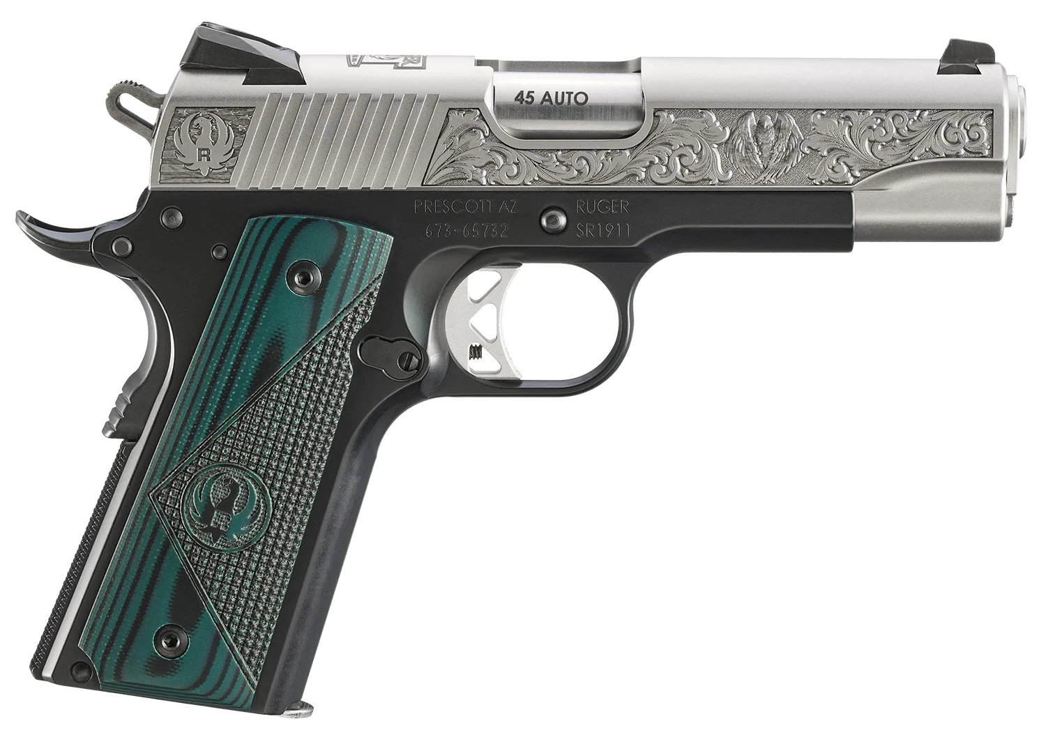 The Ruger SR1911 Mayodan, NC Edition models production will be limited to 500 total units. Featuring an engraved stainless steel slide with bald eagle on the sides with the Ruger logo and “271 Cardwell Rd.” adorned on the top of the slide; lightweight aluminum frame and polished titanium feed ramp; positive barrel lock-up; replaceable grip panels and checkered backstrap; skeletonized trigger, skeletonized hammer and titanium firing pin for faster lock time; oversized beavertail grip safety, extended thumb safety and slide stop lever; oversized ejection port and extended magazine release; inspection port allows for visual confirmation of a loaded or empty chamber and a flat mainspring housing and rear slide serrations for a positive grip. Accepts most standard, aftermarket 1911 parts and accessories.Includes two 7rd stainless steel magazines and bushing wrench.