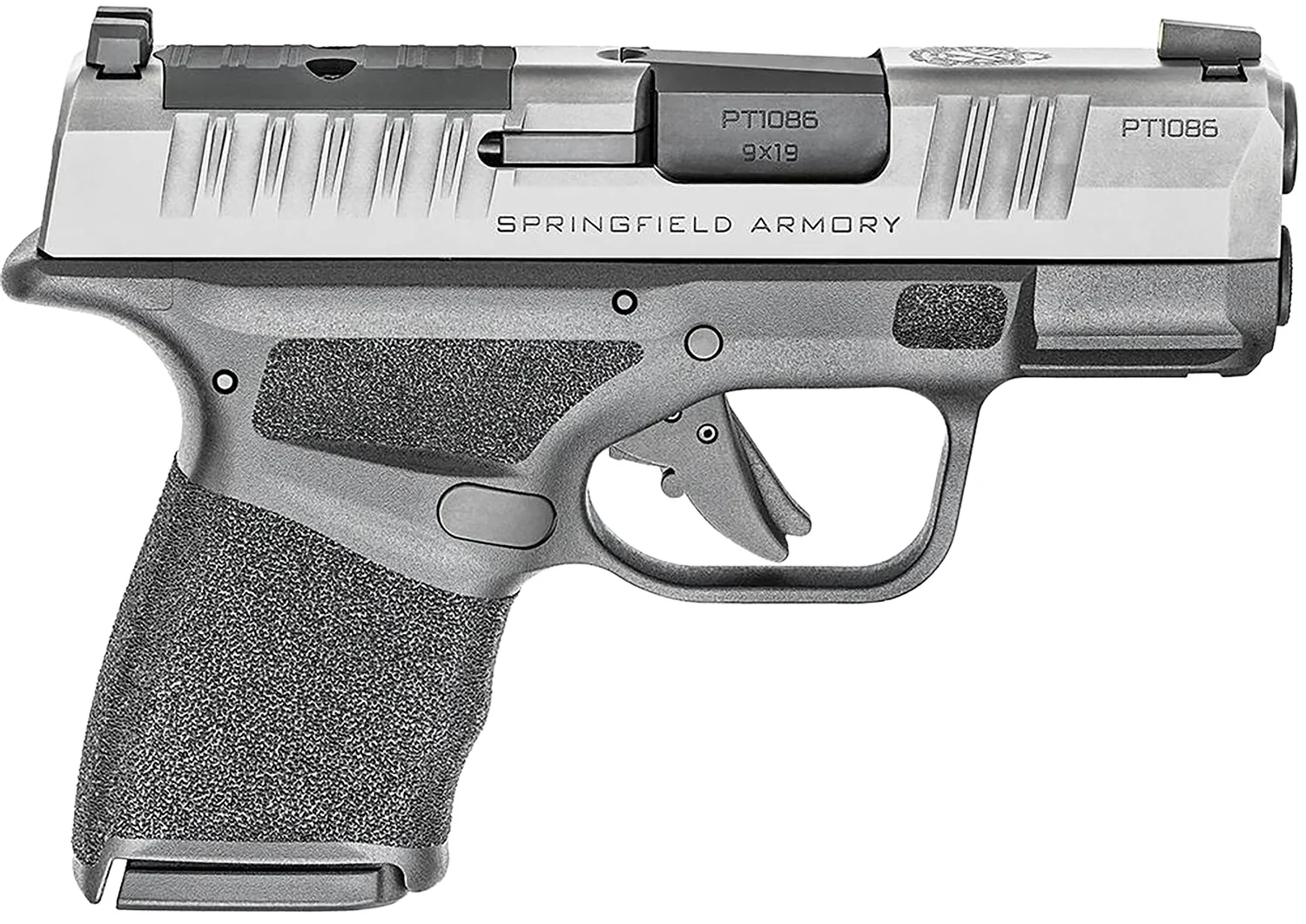 Springfield Armory micro-compact Hellcat features unique top slide serrations to maximize your grip on the slide; non-proprietary accessory rail allows you to accessories with your favorite light and/or laser; Tritium/Luminescent front sight, Tactical Rack U-Notch rear sight; reversible mag release, loaded chamber indicator and custom pressure activated grip texture. Includes 2 magazines and case.