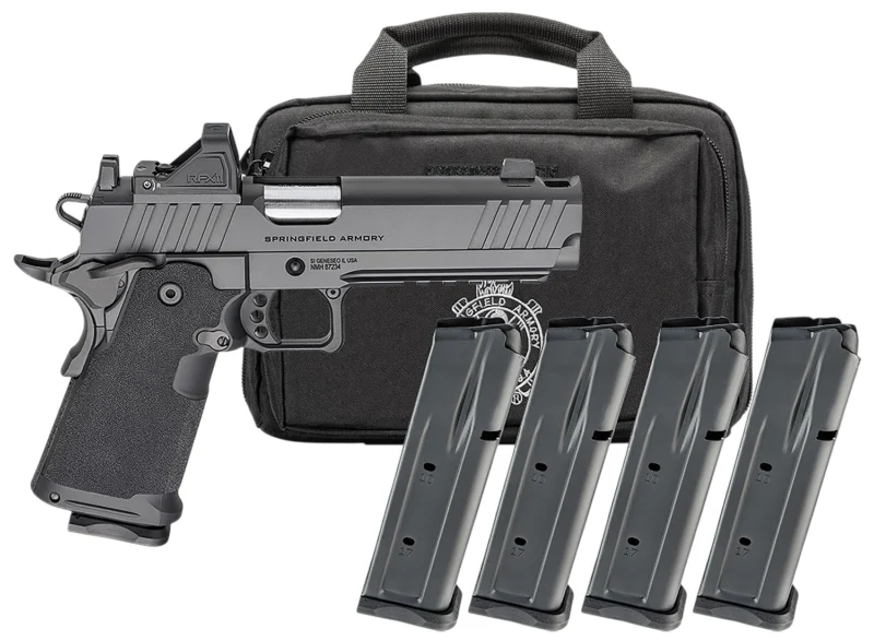 The Prodigy Comp from Springfield Armory takes the proven 1911 platform and enhances it with double-stack capacity and a performance-driven feature set. Reconfigured around a double-stack magazine, the polymer grip module mounts to a forged steel frame, offering capacities of 17+1 and 20+1. The AOS-compatible slide and barrel assembly is integrally compensated to reduce muzzle rise, while a Picatinny rail is ready to accept today’s most popular accessories. The Prodigy Comp combines the most beloved characteristics of the 1911 with modern capacity for unrivaled performance. The Gear Pac includes a Viridian RFX11 green dot optic, four magazines and a pistol bag.
