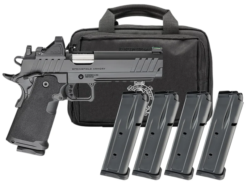 Reconfigured to satisfy states with magazine capacity restrictions, the 10rd Springfield Armory Prodigy takes the proven 1911 platform and enhances it with a double-stack design and performance-driven feature set. The polymer grip module mounts to a forged steel frame that features an ambidextrous thumb safety and an integrated Picatinny rail, while the 5″ heavy bull barrel is fitted to a forged steel slide that employs AOS (Agency Optic System) plates designed exclusively for the 1911 DS. Machined from billet steel, each plate is designed specifically to deliver proper optic height for an intuitive sight picture and features an integral rear sight. The Gear Pac includes a Viridian RFX11 green dot optic, four magazines and a pistol bag.