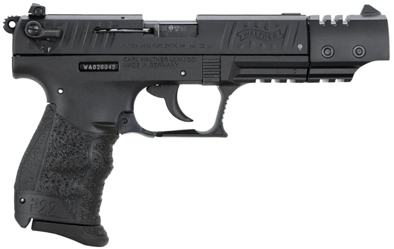 Walther Arms 5120334 P22 Target *CA Compliant 22 LR Caliber with 5″ Barrel, 10+1 Capacity, Black Finish Picatinny Rail Frame, Serrated Matte Black Tenifer Steel Slide & Interchangeable Backstrap Grip